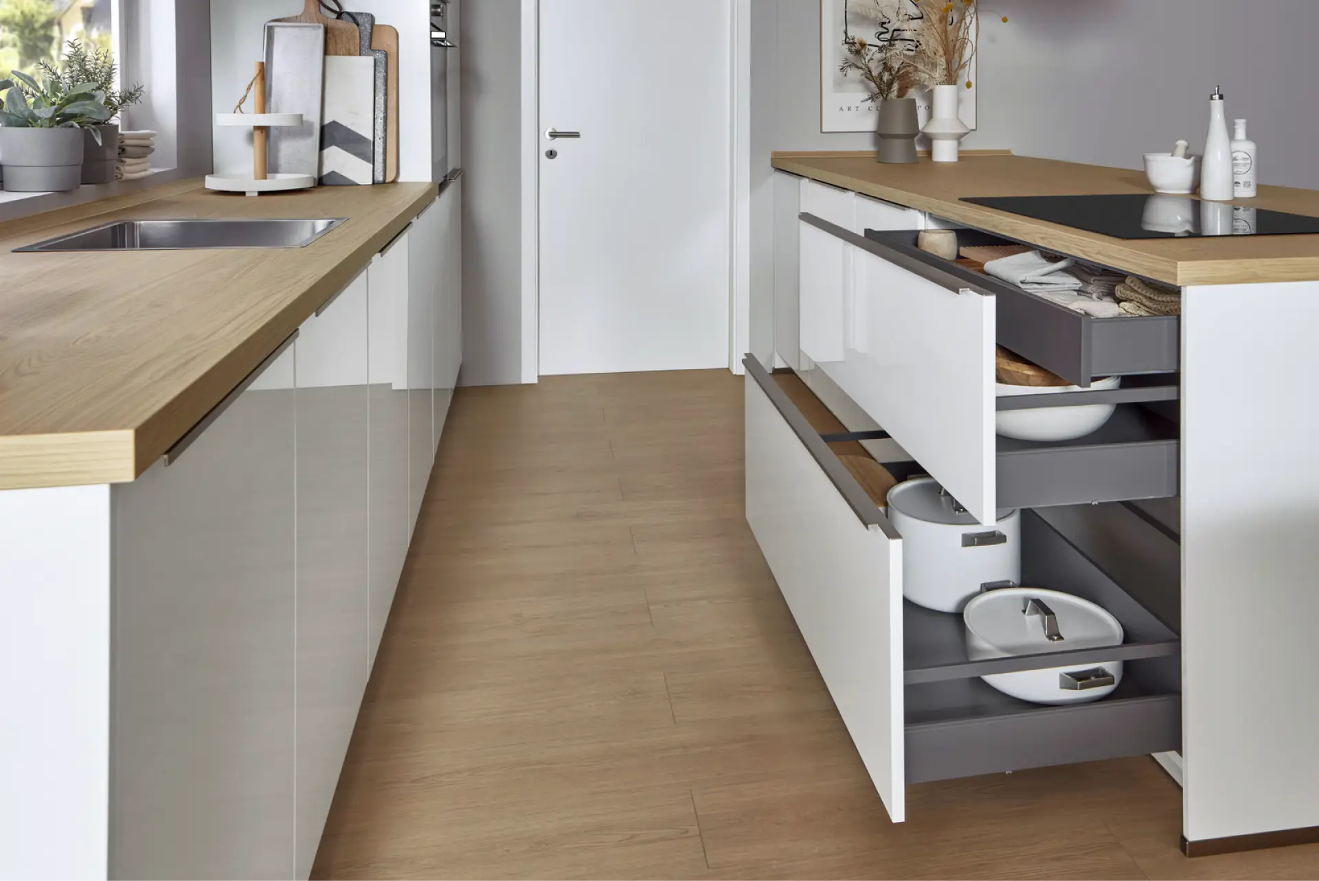 - Sockelschubladen erschließen den oft vergessenen Raum unterhalb der Unterschränke. Backbleche, seltene Küchenutensilien oder Vorräte verschwinden hier geordnet – und sind trotzdem jederzeit griffbereit.