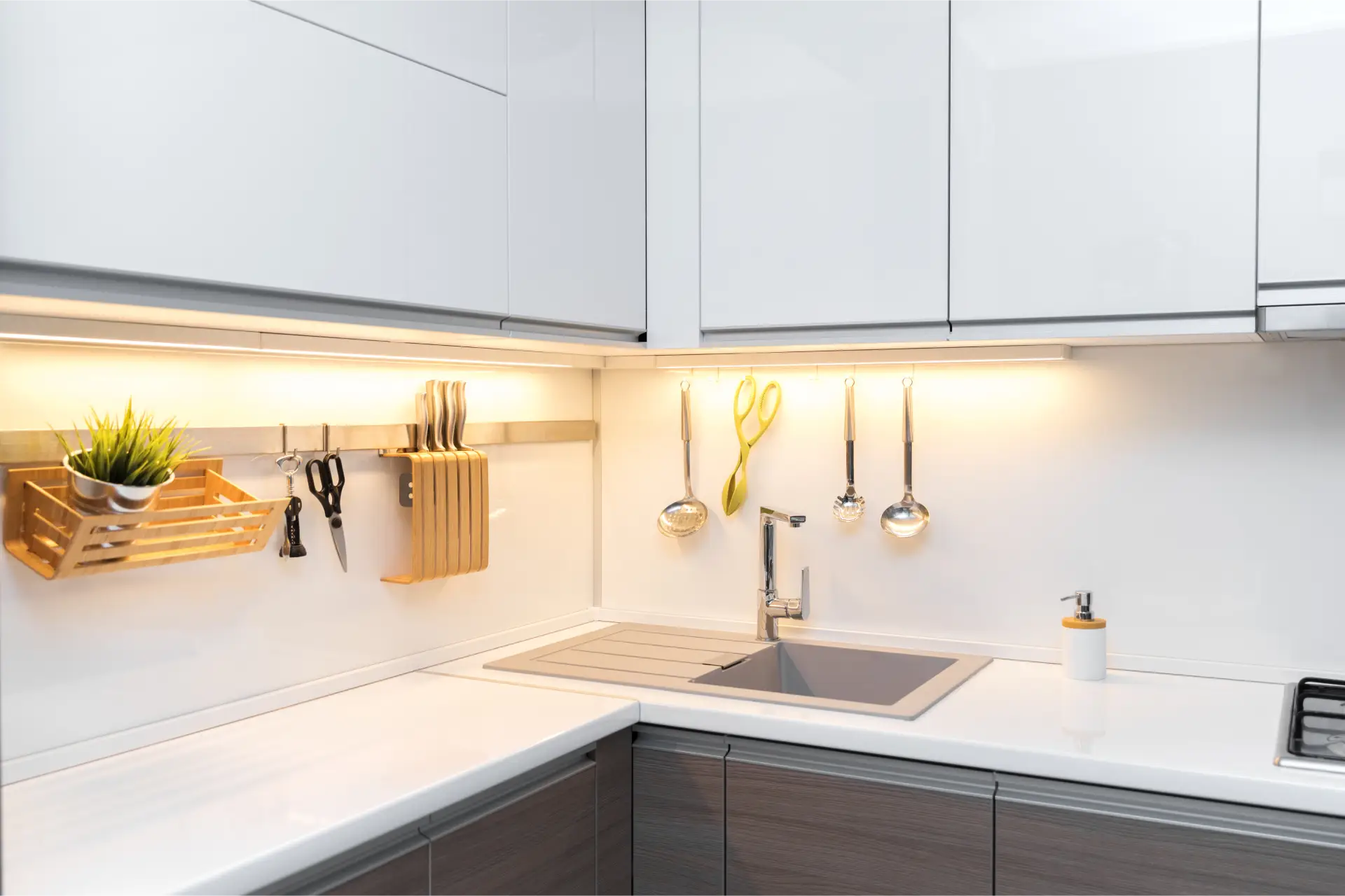- Licht und Farbe als Raumvergrößerer – Helle Farbschemata, integrierte LED-Beleuchtung und offene Regalelemente lassen kleine Küchen optisch größer wirken, ohne auf Stil verzichten zu müssen
